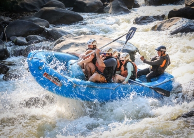 This is our signature rafting trip. 10k with a great Class III-IV rapid section on the Mae Taeng River. From our river camp we take a short 15 minute drive to “Sop Kai” village. After our full safety briefing, we set off on our adventure with the first 3 Km of exciting Class III rapids through lush jungle and amazing scenery. The upper section is gorgeous with a few fun rapids to warm up in before arriving at the top of the main Class IV section. Here everyone comes alive and gets ready for the section below. The guides will check in with each other and give the signal to go as all boats drop into the first class IV rapid. The class IV section is non-stop action. Follow your guide’s commands as you charge forward though many rewarding class IV rapids. At the bottom everyone gives a paddle high five and celebrates a job well done, completing the most exciting section of rapids in northern Thailand. But the fun is not done ~ you still have more Class III action and a scenic paddle back down to 8Adventures camp. Don’t be surprised to see an elephant while floating down this spectacular scenic section of river!